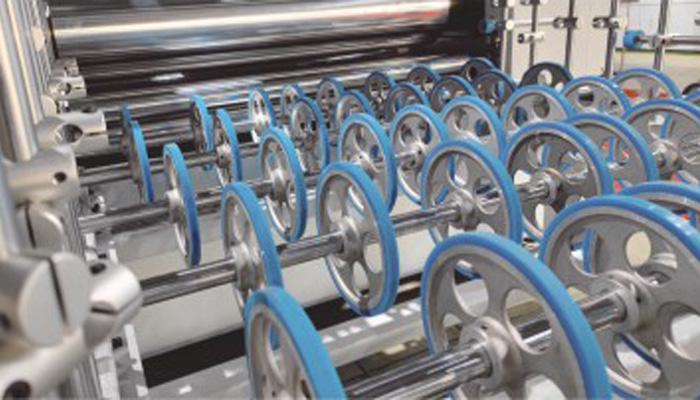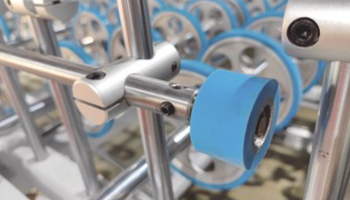 配置兩輥壓貼輥,一組膠輥和一組鋼輥;配膜張緊裝置;配電動(dòng)吊葫蘆,實(shí)現(xiàn)膜吊裝上線;包覆輥可整體單邊調(diào)節(jié)移動(dòng),快速調(diào)整尺寸。