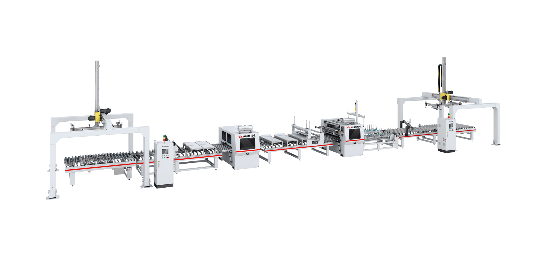 本生產(chǎn)線由:龍門上下料機 — 對中輸送機 — 粉塵清除機 — PUR涂膠機 — 恒溫隧道 — 平貼包覆機 — 斜切機 — 對中輸送機 — 龍門上下料機等部分組成。