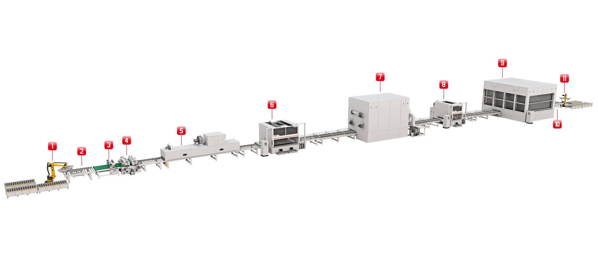 預(yù)輥實色水性乳膠漆,再噴第一次質(zhì)感涂料,待干后再噴第二次水包水涂料,形成自然立體的火燒石面效果,是外墻最受熱選的一種效果。后段配平鋪式立體干燥房,避免了厚噴漆膜流掛的現(xiàn)象,同時實現(xiàn)油漆快速干燥,將能耗降至最優(yōu)。