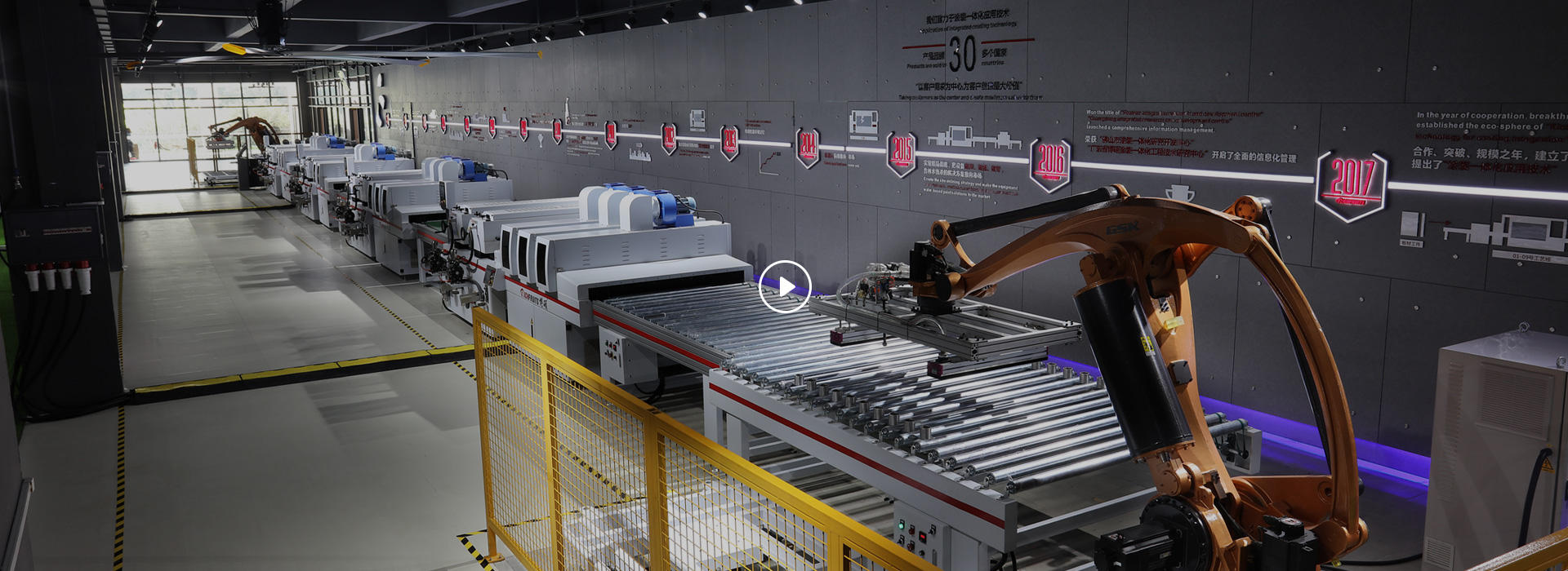 平面涂裝設備系列(輥涂、淋涂、膜壓、打印、轉印、平貼、包覆)、自動噴漆設備系列、油漆干燥設備系列(準分子膚感、EB固化設備、UV固化機、立體干燥房、冷紅外干燥、IR干燥隧道、超能水性漆干燥隧道)、機器人應用系列(噴漆、噴膠、噴粉、搬運)、自動化設備系列;針對不同的基材、涂料和工藝研制生產出環(huán)保、高效、高品質的各種數(shù)字化涂裝生產線。