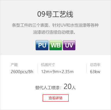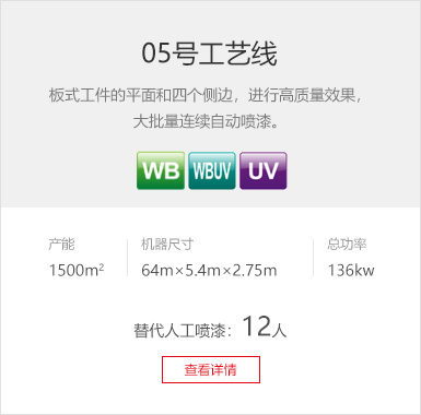 工藝要求 UV底漆、水性色漆、水性LED-UV面漆 產(chǎn)品種類 膜壓PVC櫥柜門板、定制衣柜、線條 產(chǎn)線數(shù)量 3條 設(shè)備特色 LED-UV固化系統(tǒng)、立體干燥房配2臺(tái),待干1小時(shí) 生產(chǎn)產(chǎn)能 UV底漆噴涂線:1800m2/8h (生產(chǎn)員3人/線)