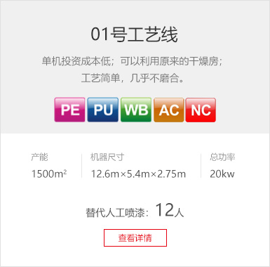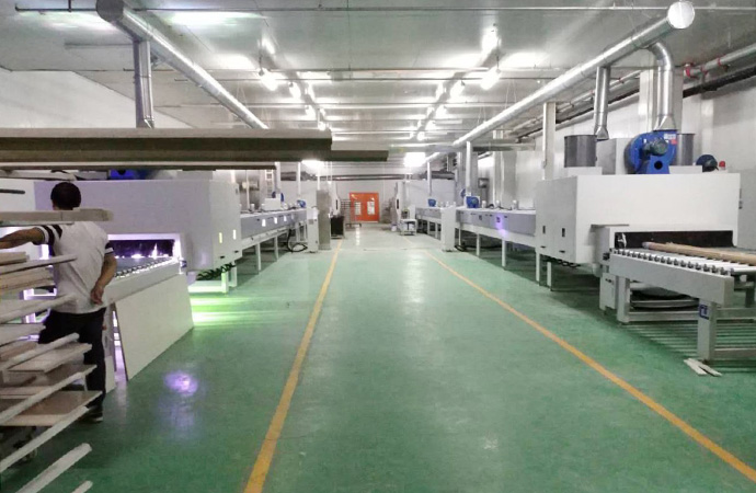 工藝要求 無溶劑UV底漆、水性UV底漆 產(chǎn)品種類 全屋定制、櫥柜、衣柜、木門、線條 產(chǎn)線數(shù)量 4條/廠 設(shè)備特色 無溶劑UV底、水性UV底漆,達到PU質(zhì)感的98%以上。 生產(chǎn)產(chǎn)能 UV底漆噴涂線(兩條):3600m2/8h (生產(chǎn)員3人/線)
