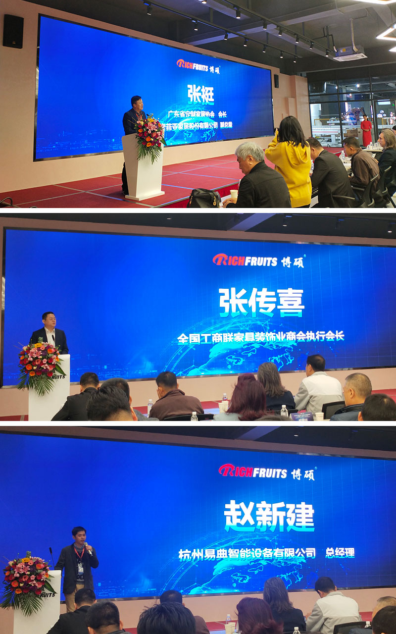同時,廣東省定制家居協(xié)會會長索菲亞副總裁張挺、全國工商聯(lián)家具裝飾商會執(zhí)行會長張傳喜、杭州易典智能設備總經(jīng)理趙新建都為博碩涂裝一體化智能體驗館點贊!尤其索菲亞副總裁張挺張總高度贊揚了博碩的智能涂裝系統(tǒng),現(xiàn)國內(nèi)甚至是全世界最先進的智能涂裝系統(tǒng)落地于蘭考索菲亞工廠。