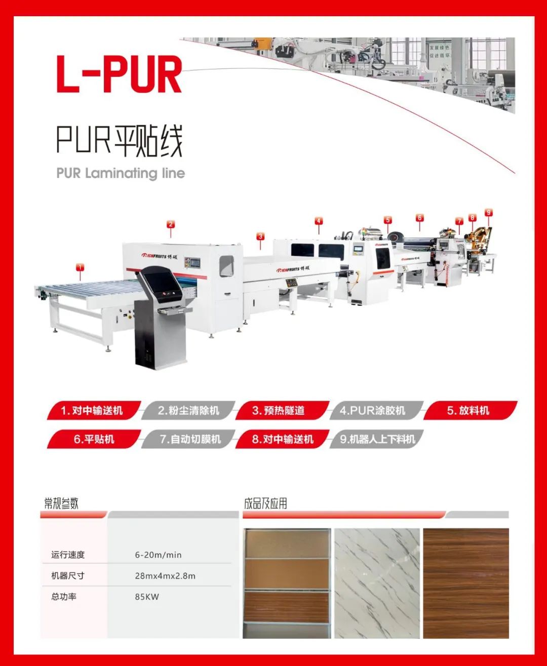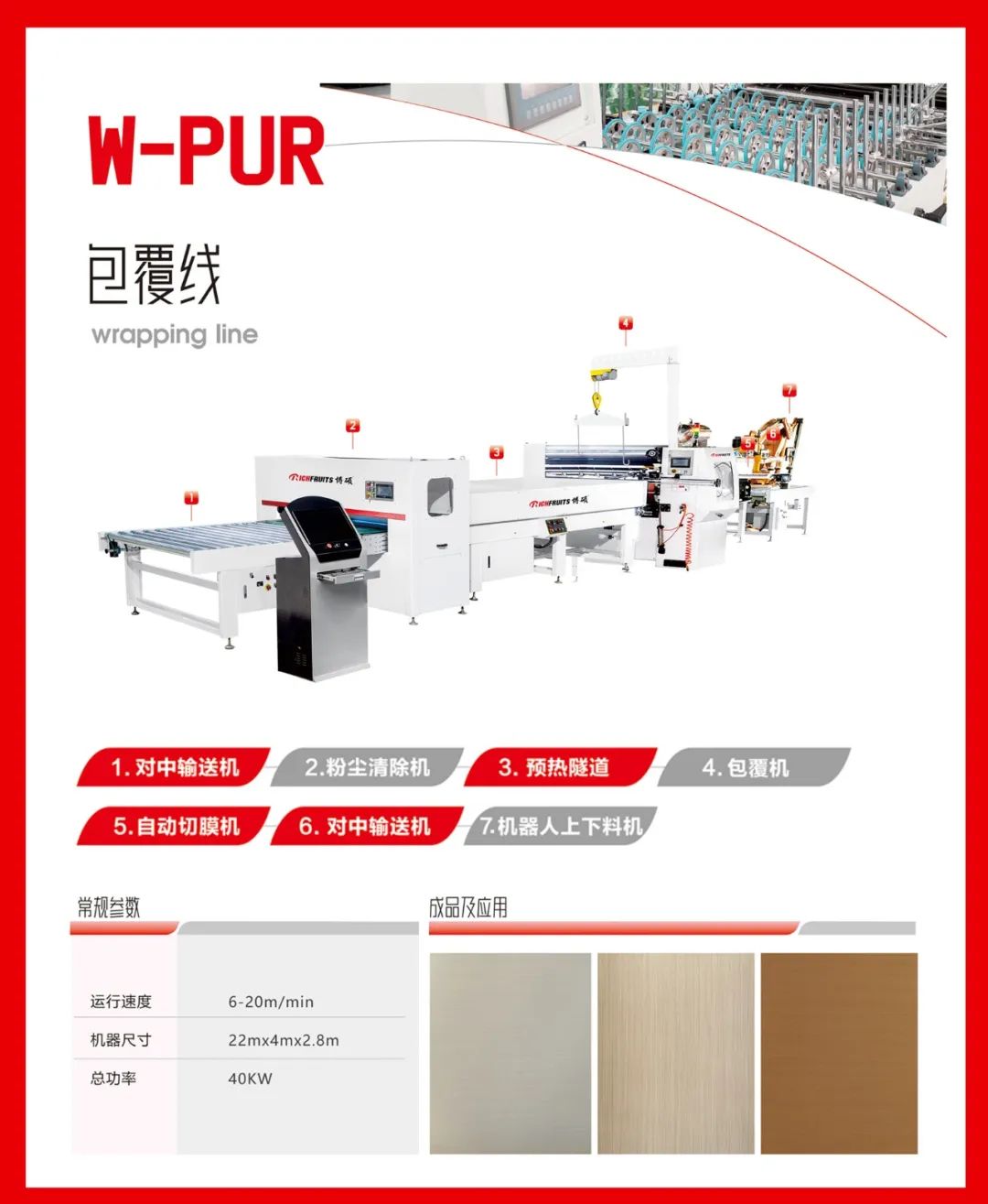 通用于包覆種類的產(chǎn)品,比如:硅酸板、水泥纖維板、門芯板多層墻板等材料進行PUR膠水涂布后包覆各種柔性貼材。