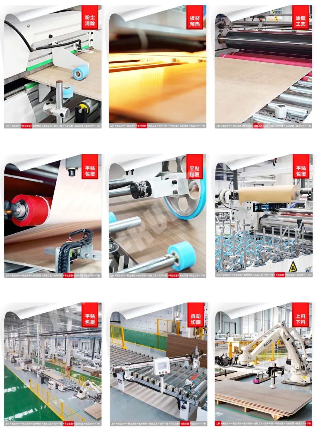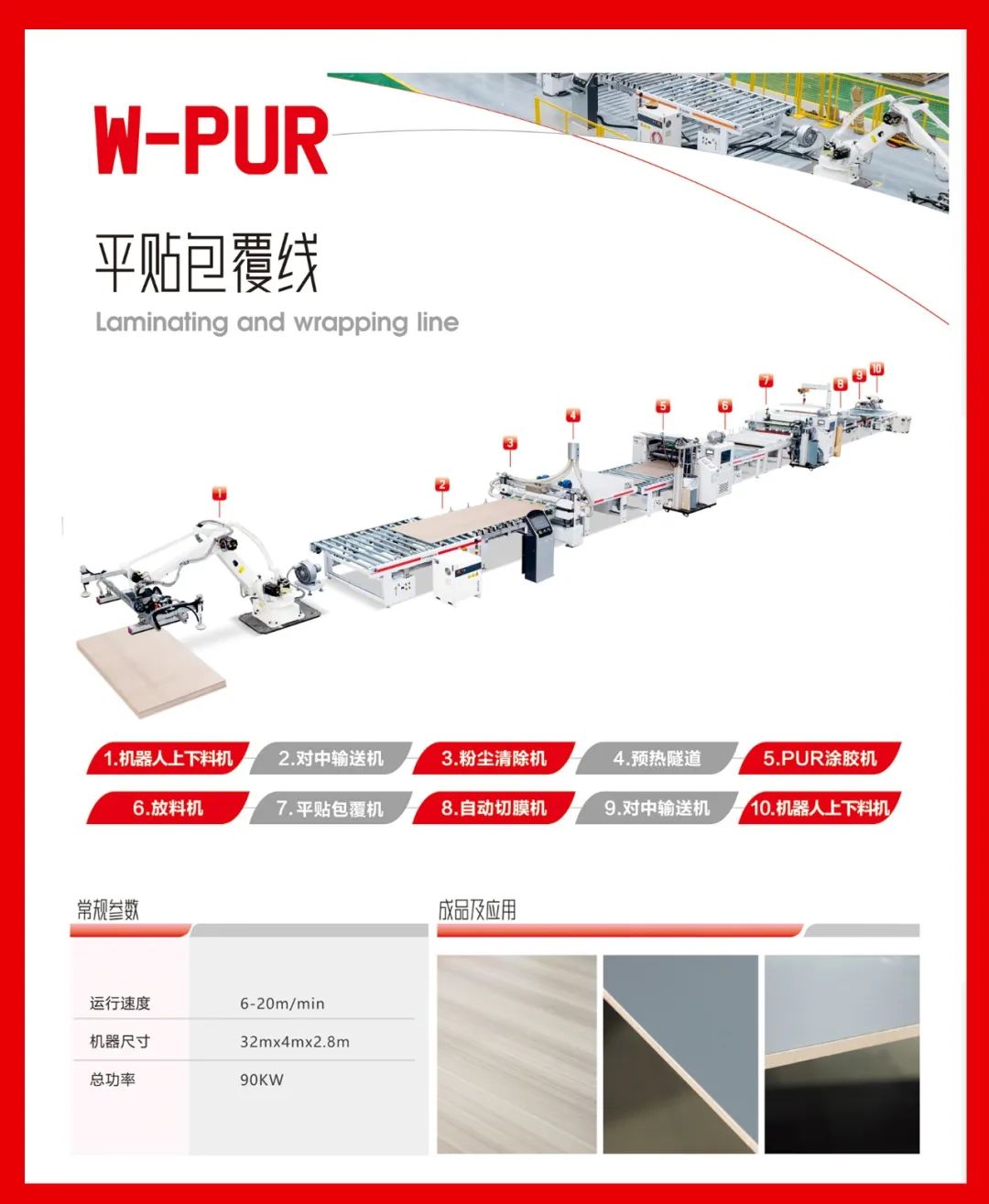 可片材、可卷材混合生產(chǎn)。通用PET、PETG、PP、PVC、CPL、防火板、亞克力、鋁箔、SPC等飾面材,利用PUR膠水均勻平貼或包覆到板材表面。 通用于包覆種類的產(chǎn)品,比如:硅酸板、水泥纖維板、門芯板多層墻板等材料進行PUR膠水涂布后包覆各種柔性貼材。