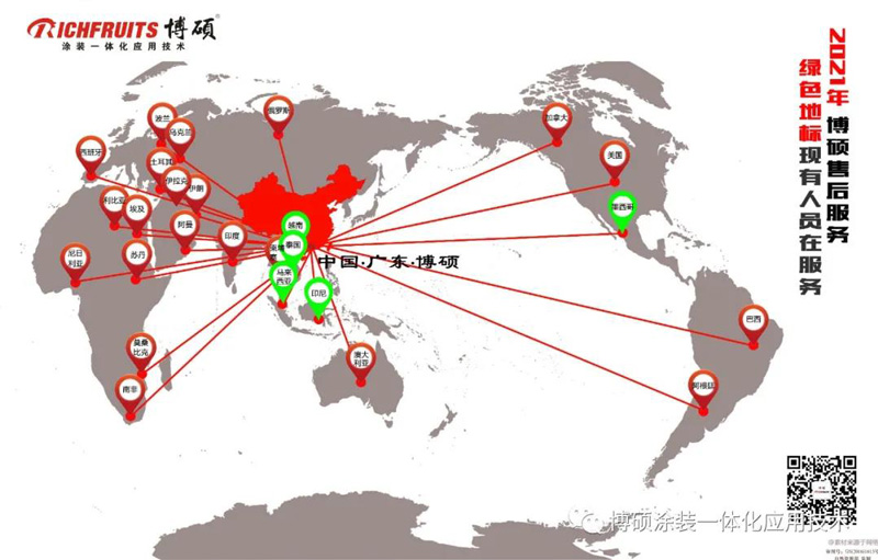 博碩公司積極響應(yīng)政府“一帶一路”的政策,憑借在涂裝設(shè)備產(chǎn)業(yè)的持續(xù)技術(shù)創(chuàng)新、高品質(zhì)的入式技術(shù)服務(wù)能力,素以性能穩(wěn)定、高性價比、綜合應(yīng)用強在行業(yè)內(nèi)著稱,產(chǎn)品服務(wù)于國內(nèi)31個省、市、自治區(qū);遠(yuǎn)銷俄羅斯、烏克蘭、伊朗、美國、印度、波蘭、阿曼、羅馬尼亞、土耳其、阿爾巴里亞、墨西哥、尼日尼亞、伊拉克、迪拜、巴西、越南、印度尼西亞、馬來西亞、斯里蘭卡等全球50多個國家。